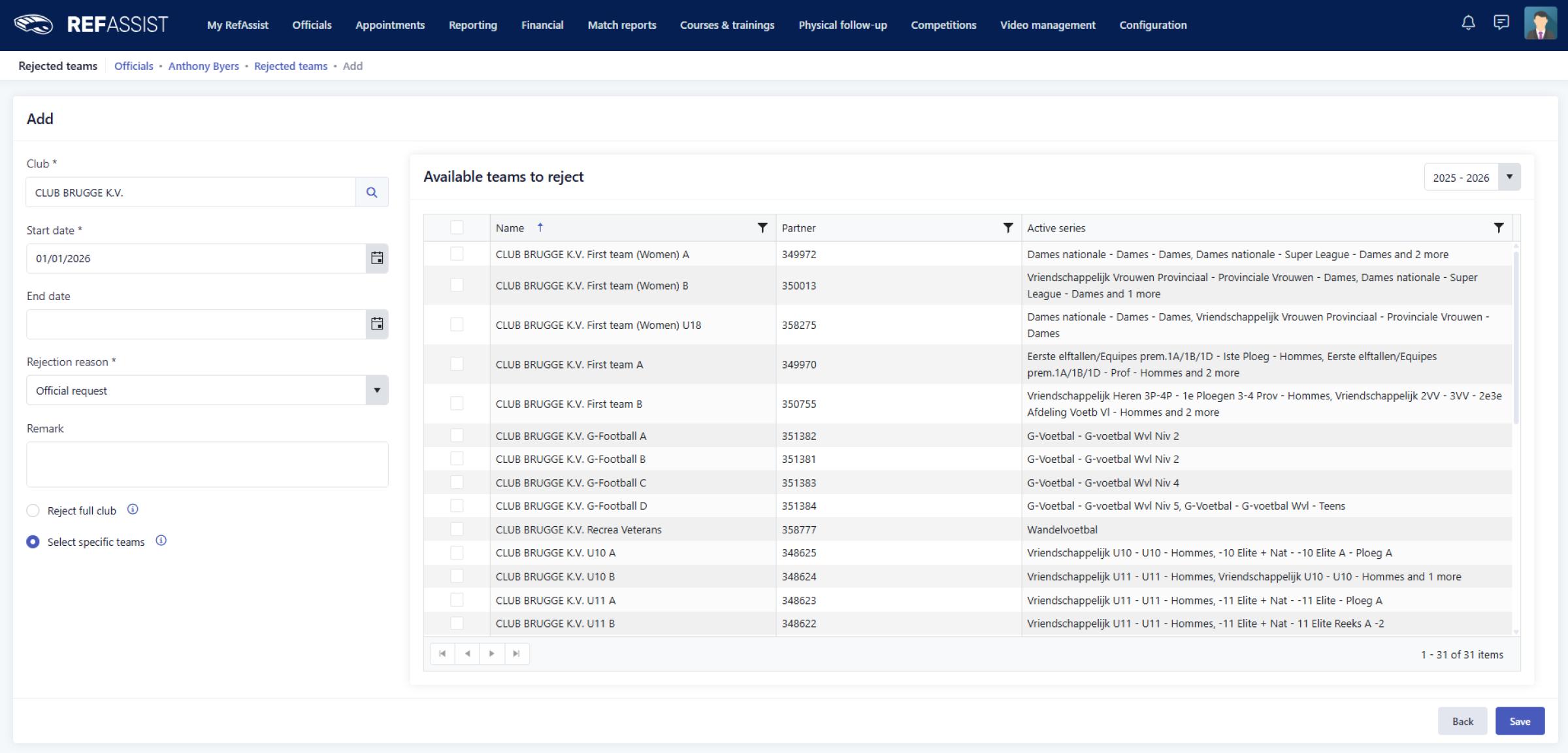 Après avoir en discuté avec nos clients, nous avons amélioré la fonctionnalité des clubs rejetés. Il est désormais plus facile et plus efficace de rejeter un officiel des matchs des clubs et équipes spécifiques.